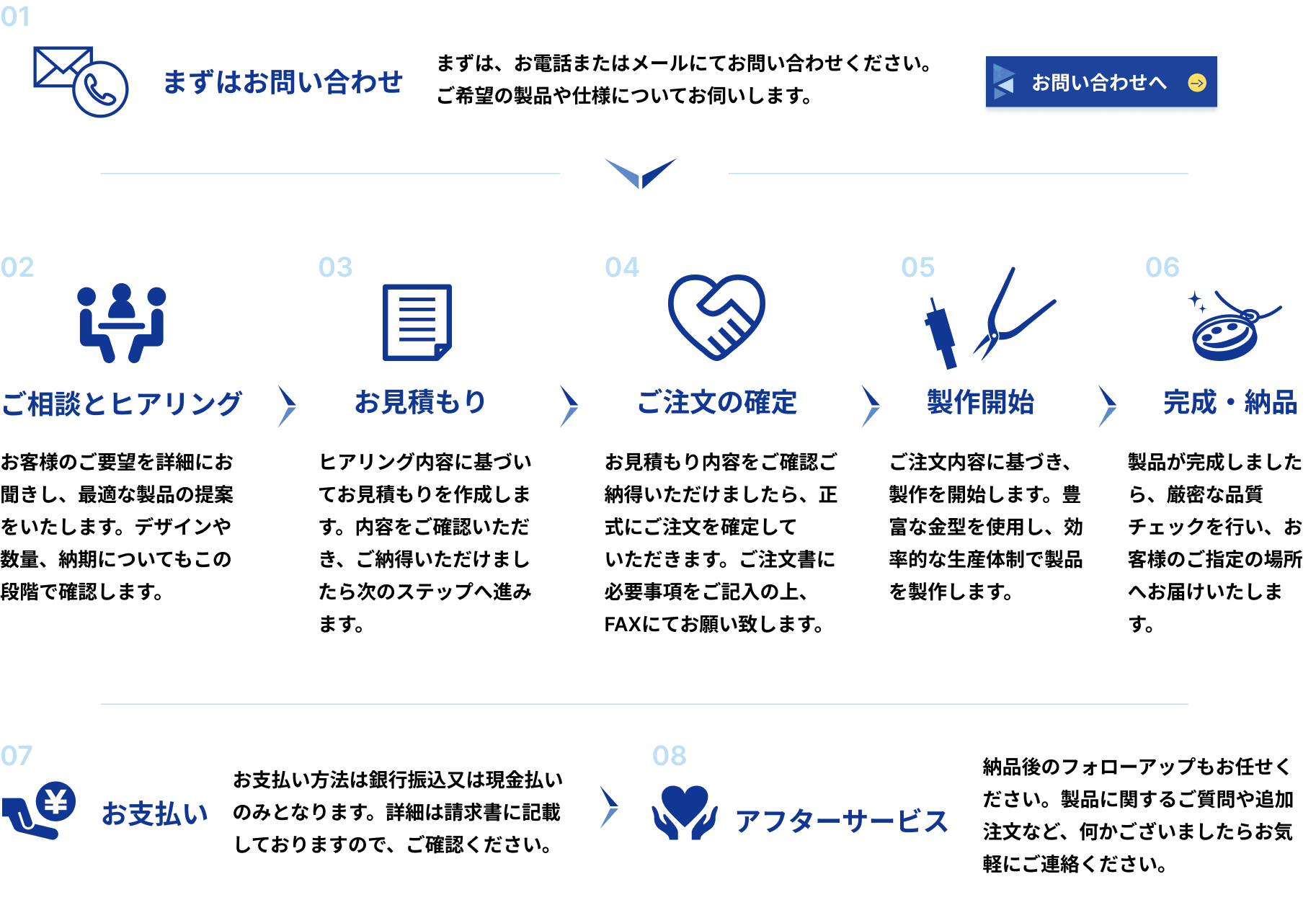 納品後のフォローアップもお任せください。製品に関するご質問や追加注文など、何かございましたらお気軽にご連絡ください。